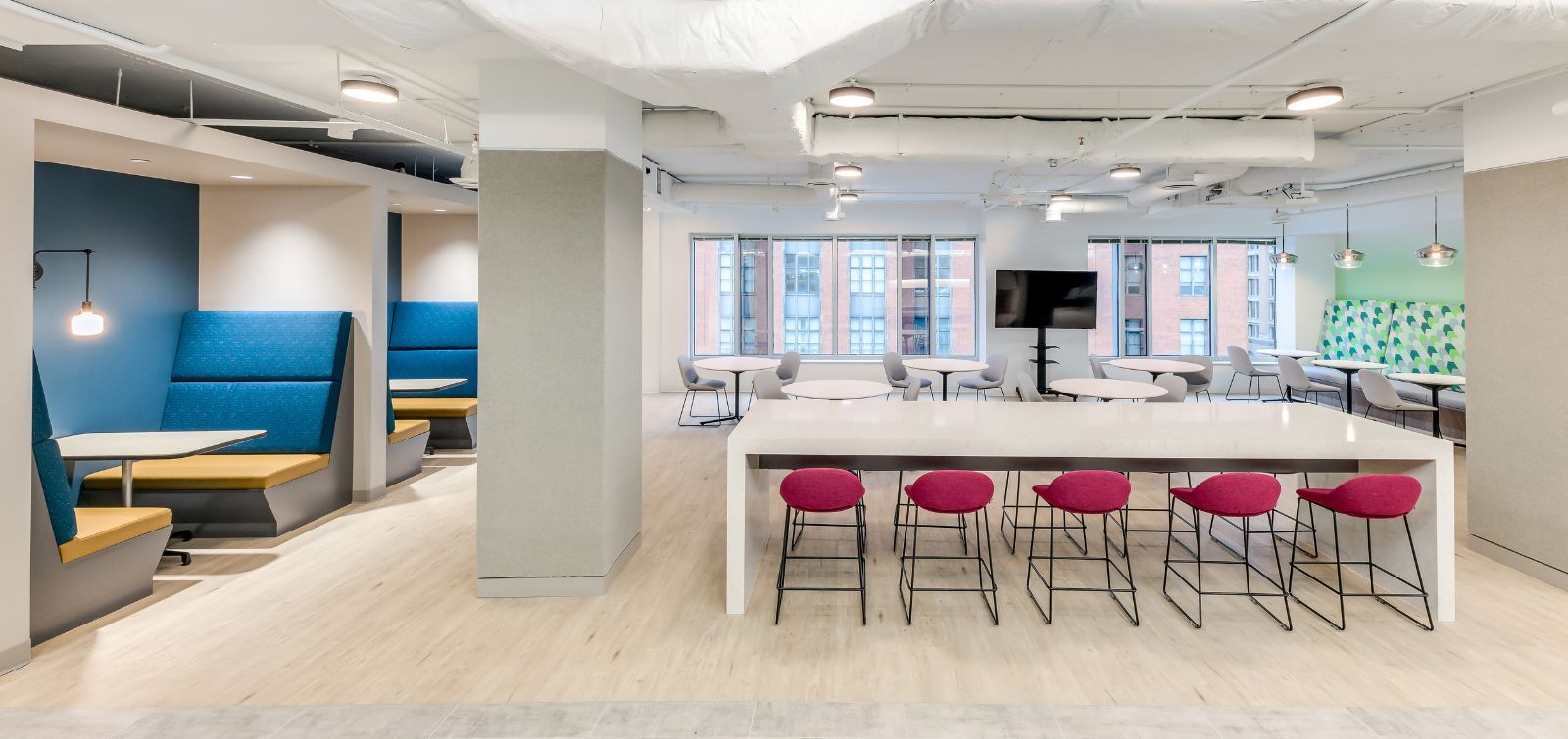 Renovations were executed at the height of the COVID pandemic, with more than 300 employees working remotely. The transformed office now features a state‑of‑the‑art conference center, catering pantry, café, client experience center, huddle and team rooms, and hoteling space for remote staff.